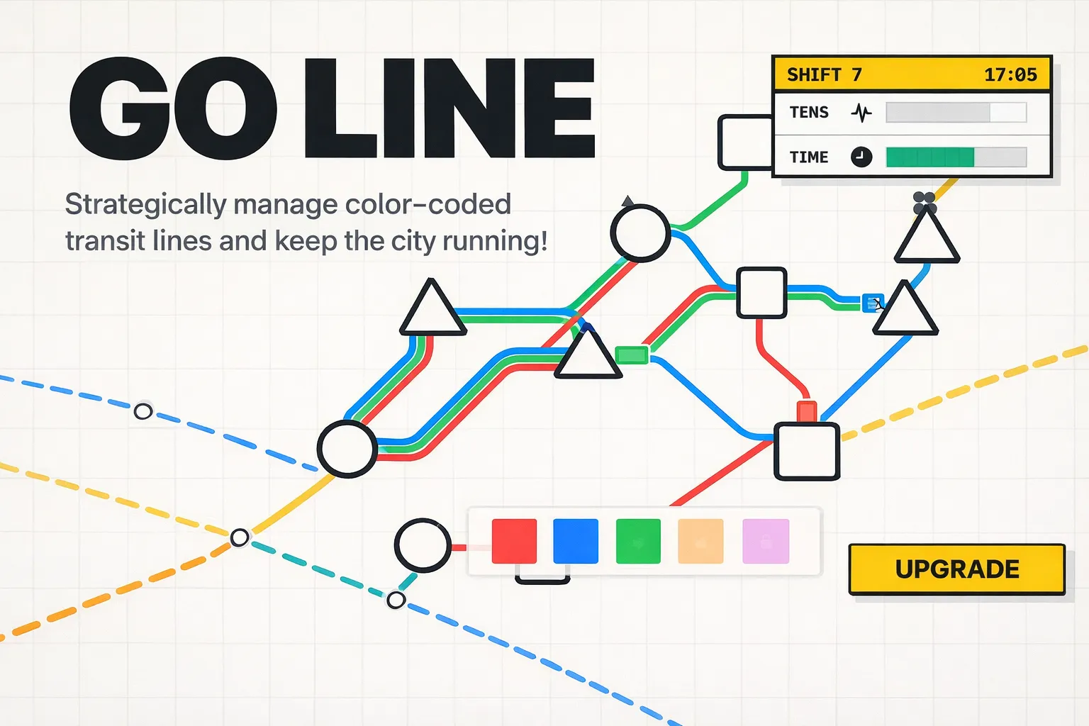 Go Line is a strategic puzzle game challenging you to keep a growing city's transit flowing. Draw lines between stations, transport passengers to their unique destinations, and prevent network tension from spiraling out of control. Every shift brings new upgrades, color-coded lines, and ever more intricate networks to manage.